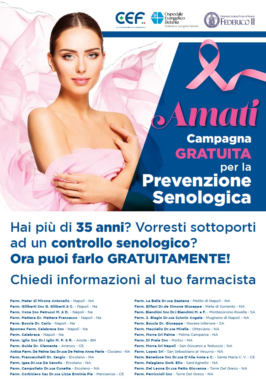Per facilitare le visite senologiche parte la campagna AMATI, con cui CEF, l’Ospedale Evangelico Betania di Napoli e l’Università Federico II di Napoli consentono di effettuare la prenotazione in farmacia e poi recarsi in ospedale per il controllo.