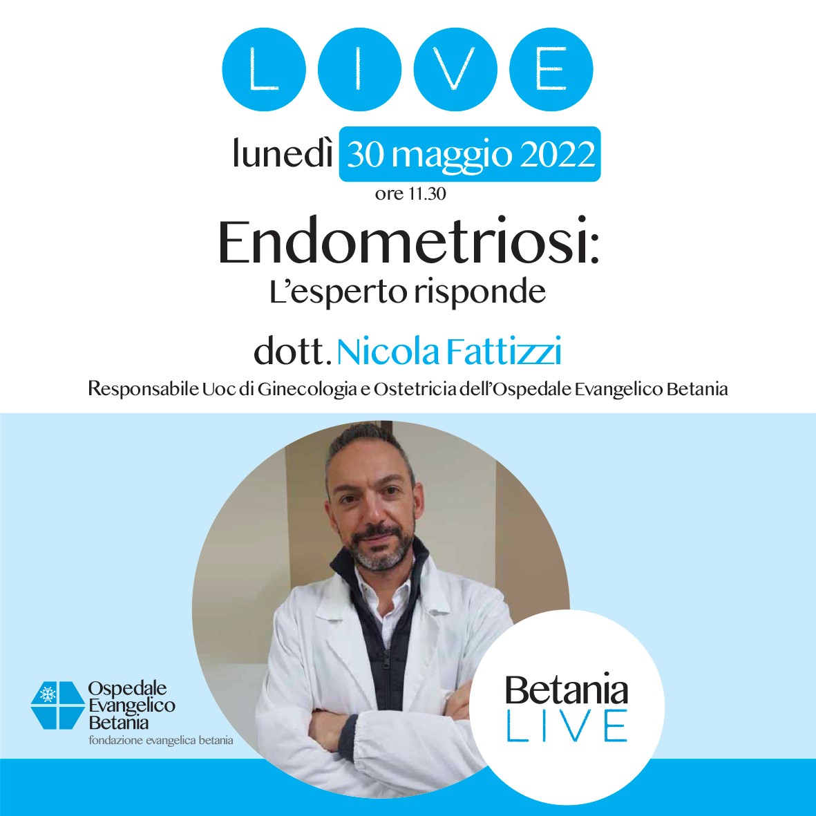 Nasce BETANIA LIVE, il nuovo progetto dell’Ospedale Evangelico Betania, che prevede un ciclo di dirette Facebook con i medici dei diversi dipartimenti dell’Ospedale. Un appuntamento che diventerà fisso e che punta a creare un rapporto diretto ed interattivo della struttura e del sistema sanitario con gli utenti.